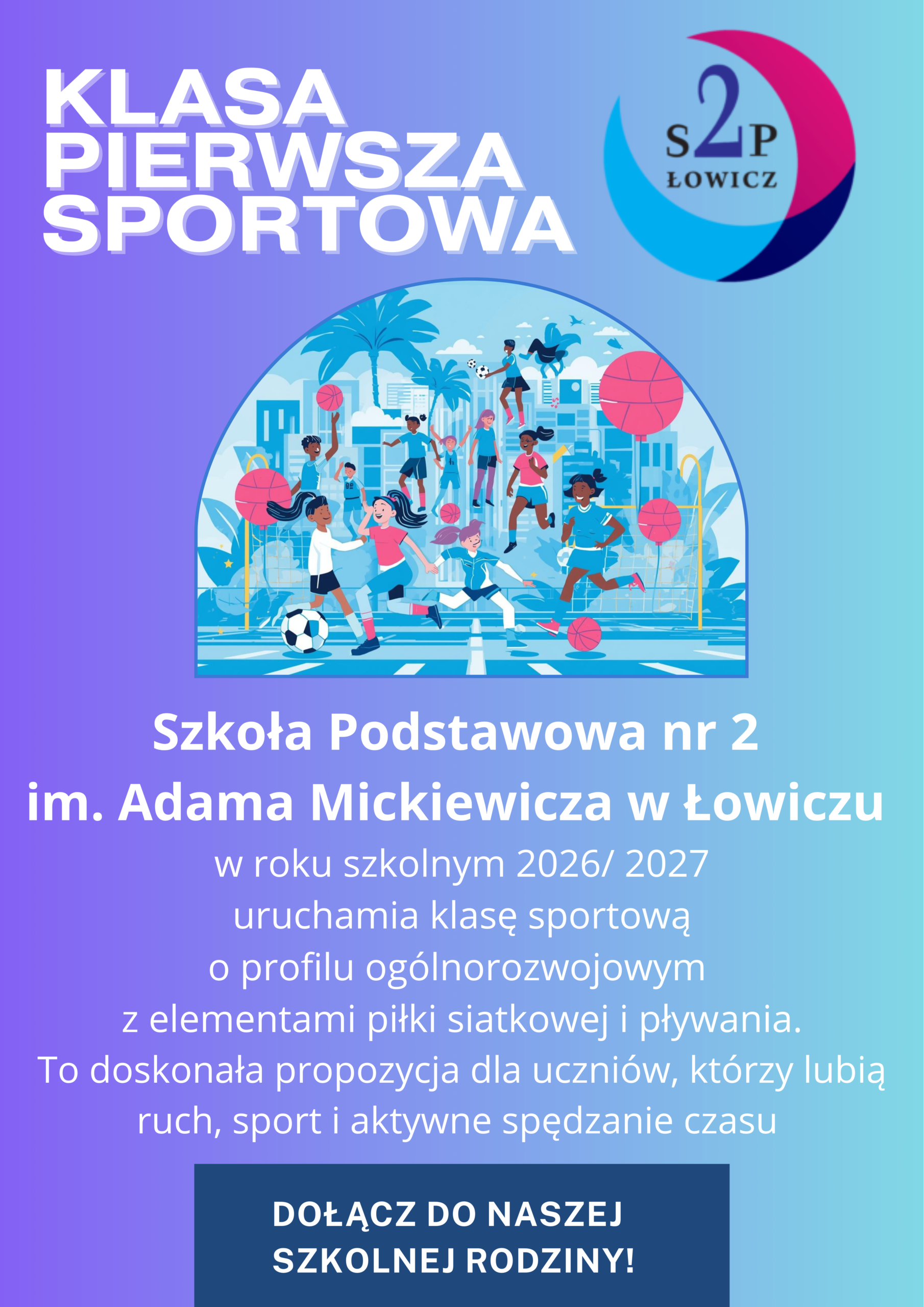że za zgodą Burmistrza Miasta Łowicza pana Mariusza Siewiery, w roku szkolnym 2026/2027 będzie utworzona dla przyszłych pierwszoklasistów klasa sportowa o profilu ogólnorozwojowym. To doskonała propozycja dla uczniów, którzy lubią ruch, sport i aktywne spędzanie czasu, a jednocześnie chcą rozwijać swoje umiejętności w przyjaznym